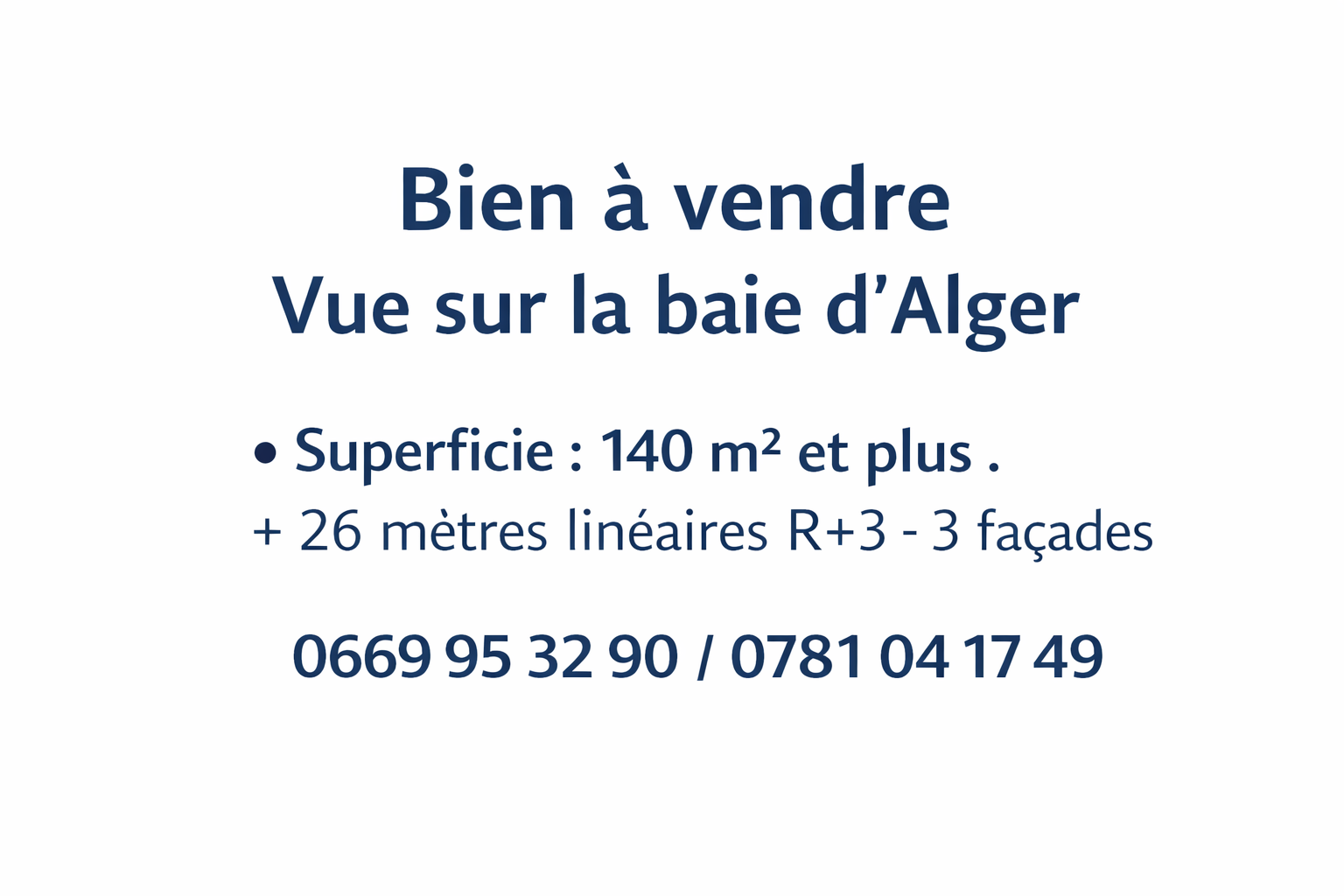 À vendre bien rare offrant une vue imprenable sur la baie d’Alger (est & ouest), situé sur le même trottoir que l’ENTV et le CTC (MES / CTCs), dans un secteur stratégique et très recherché.